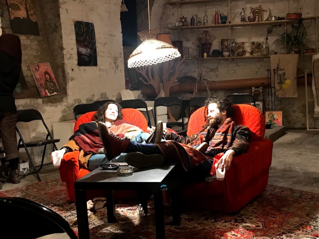 One day, I will get off the tram, cut to the narrow side-street, on time for a change, I will find the rolled-up shutters over the run-down doors, put my hand in through the missing window, turn the handle, walk down the stairs, the lights will be off, but that happens, so I’ll proceed with the phone torch, I’m already hearing the others, so many of them in fact, but when I make my way to the room I’ll find it empty and there will be too many Christmas lights casting shadows on the mannequin reclining atop the bar, and all the paintings will be hanging upside down, and finally I’ll realize that all the voices of all the people who sat and wrote and read aloud in his group in these chairs, are being played back through countless little speakers, all the laughs and silences and slammed words are looping one over the other, and then my biggest fear will finally reveal itself, that of hearing my own terrible voice reading aloud my own terrible pieces • Ꙩ • Ꙫ • Ꙩ •, but though my ears will be sweaty I’ll fail to locate me in the din, until my feet are fleeing the room and on the doorway stands he, Mátyás with his dreads in a crown of Christmas lights, and he says: